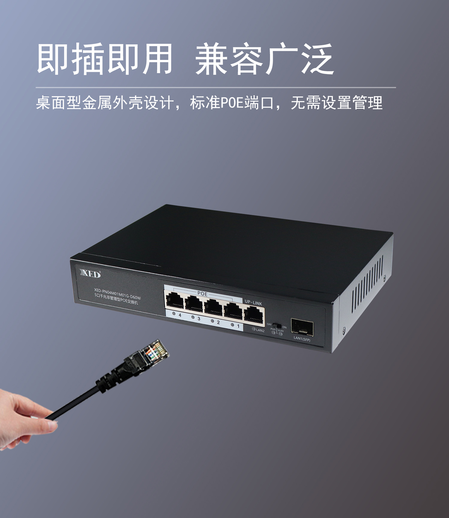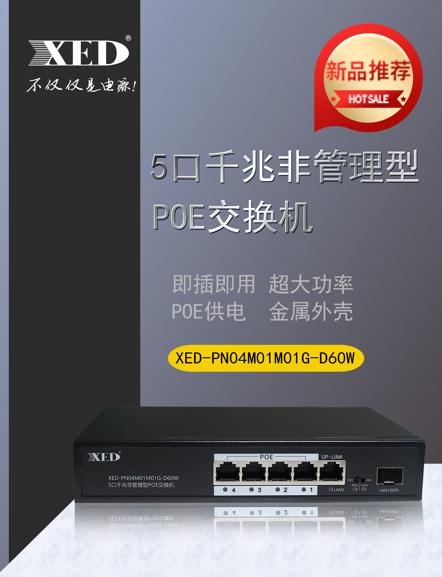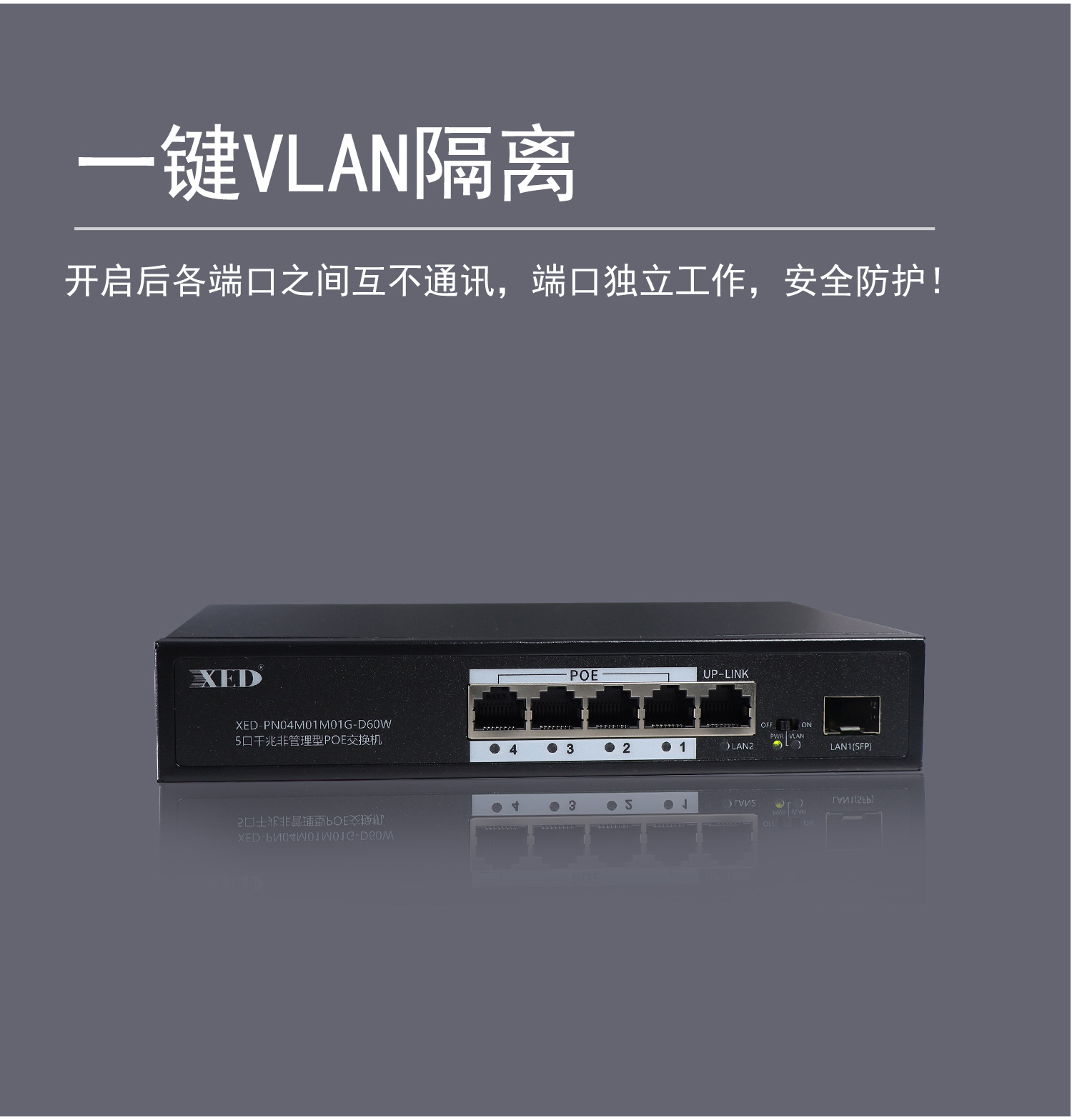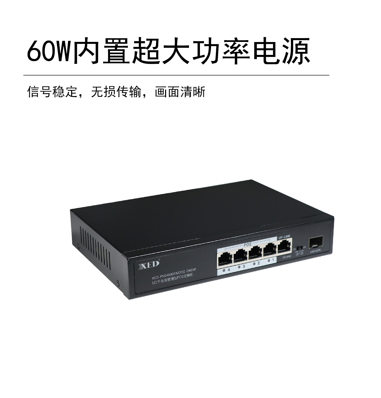 XED-PN04M01M01G-D60W 4+1千兆POE交換機(jī),可通過網(wǎng)線為無線AP,攝像頭等PD設(shè)備提供最大單端口30W供電,支持一鍵開啟VLAN模式,完全滿足新一代組網(wǎng)需求,適用家庭,酒店,中小企業(yè)等各類場景;為您構(gòu)建更安全、更快速、可增值的可靠網(wǎng)絡(luò)。