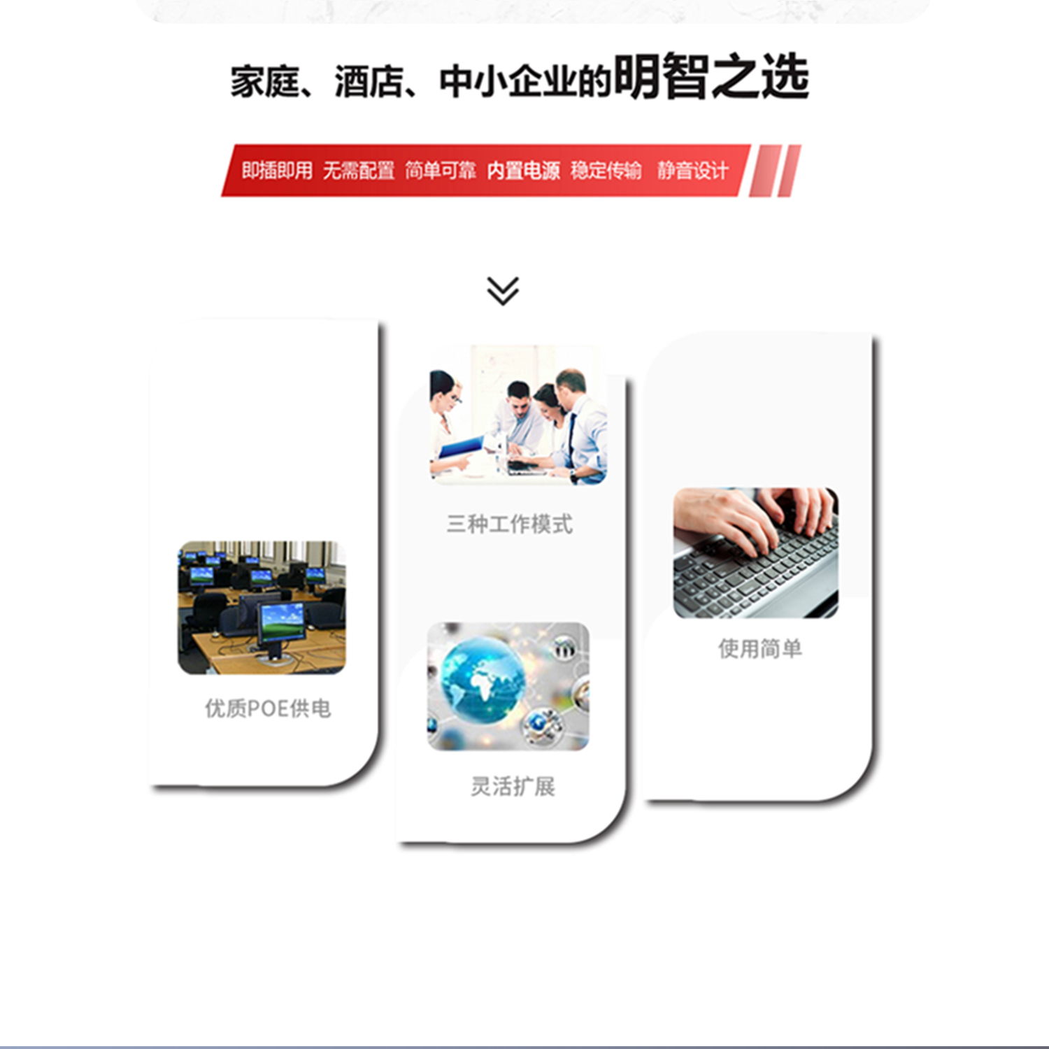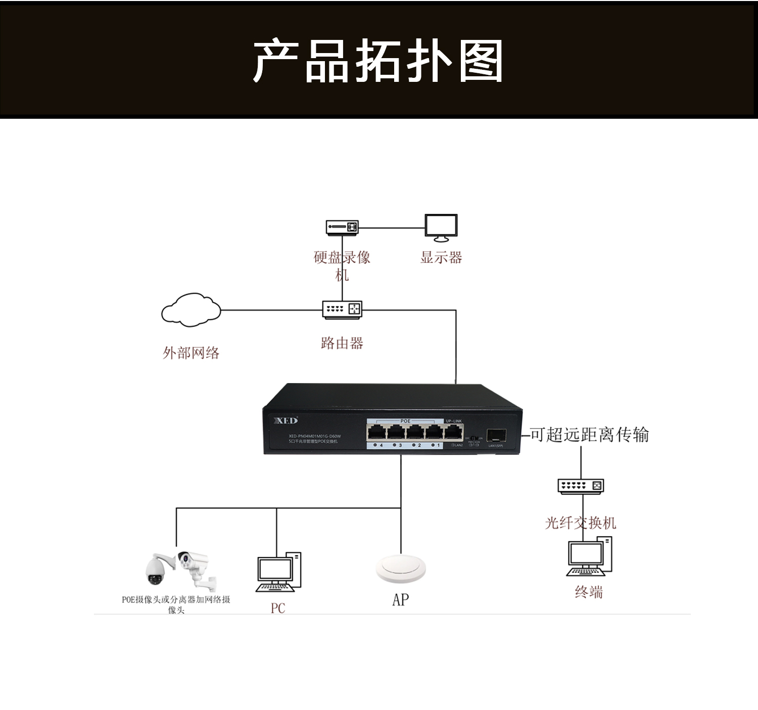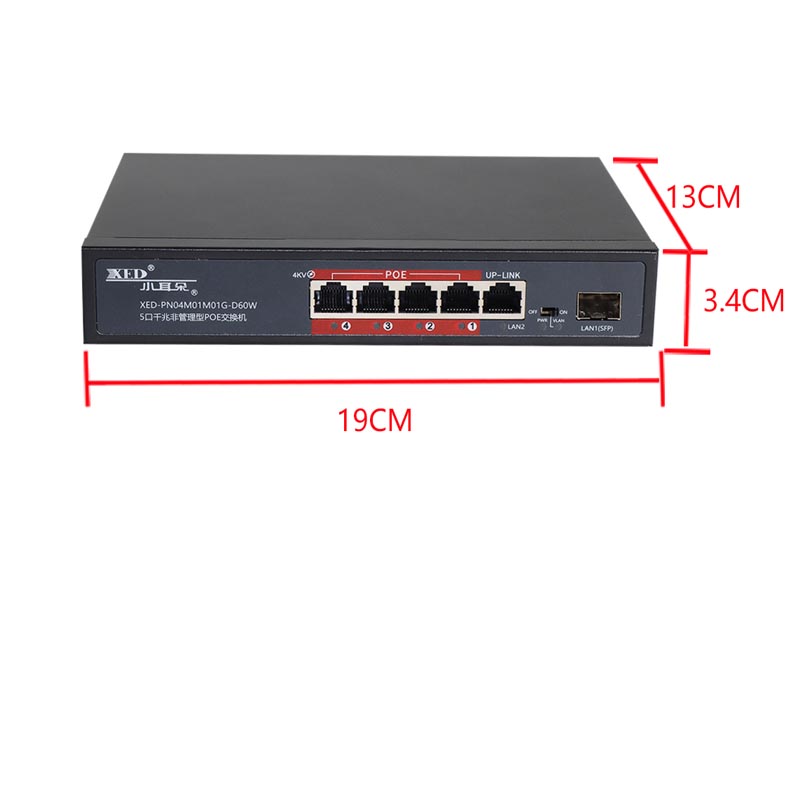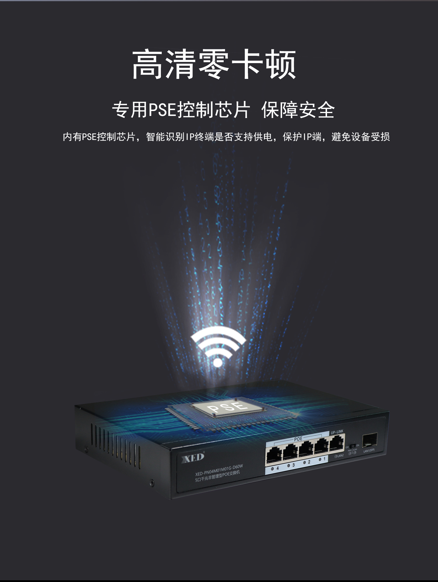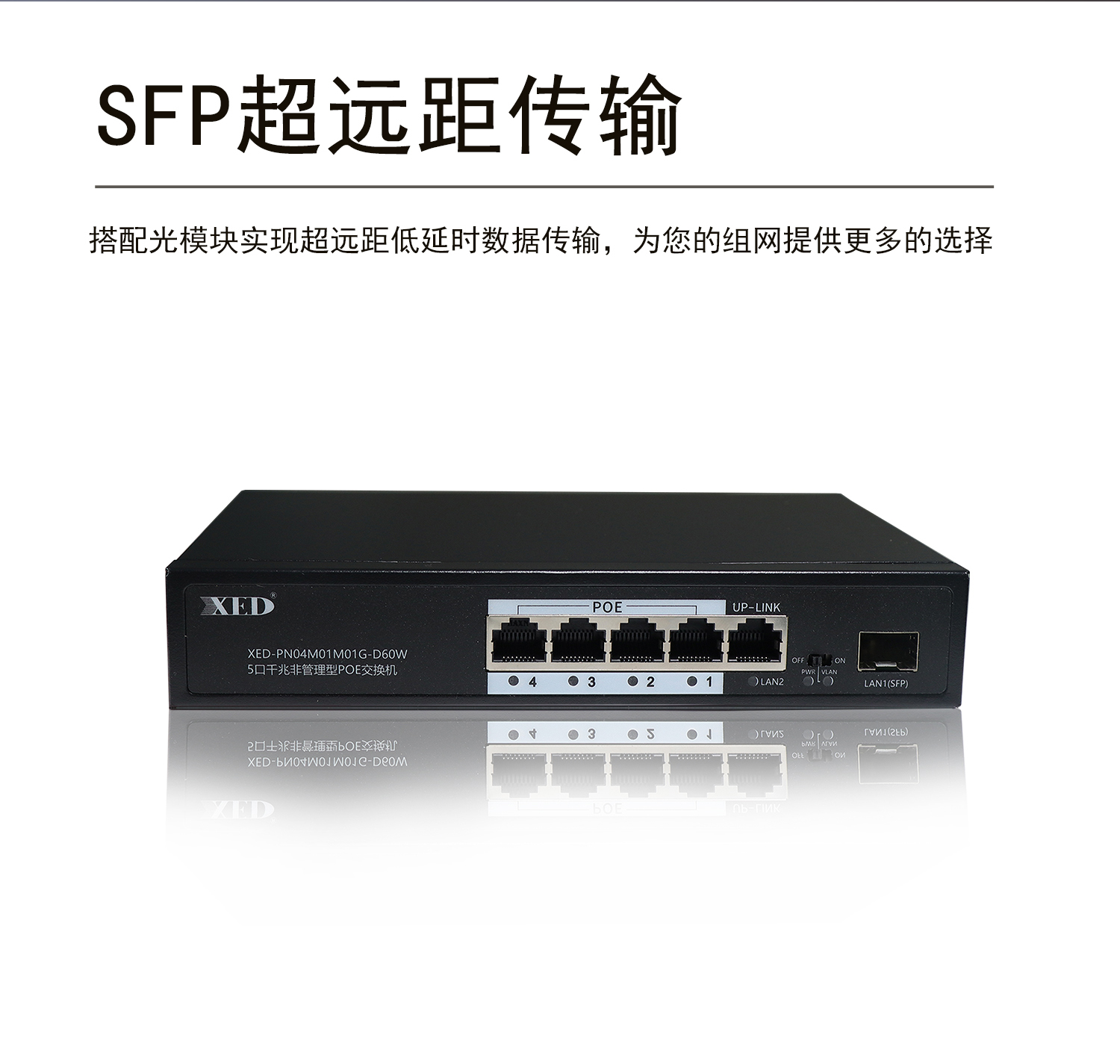 XED-PN04M01M01G-D60W 4+1千兆POE交換機(jī),可通過網(wǎng)線為無線AP,攝像頭等PD設(shè)備提供最大單端口30W供電,支持一鍵開啟VLAN模式,完全滿足新一代組網(wǎng)需求,適用家庭,酒店,中小企業(yè)等各類場景;為您構(gòu)建更安全、更快速、可增值的可靠網(wǎng)絡(luò)。