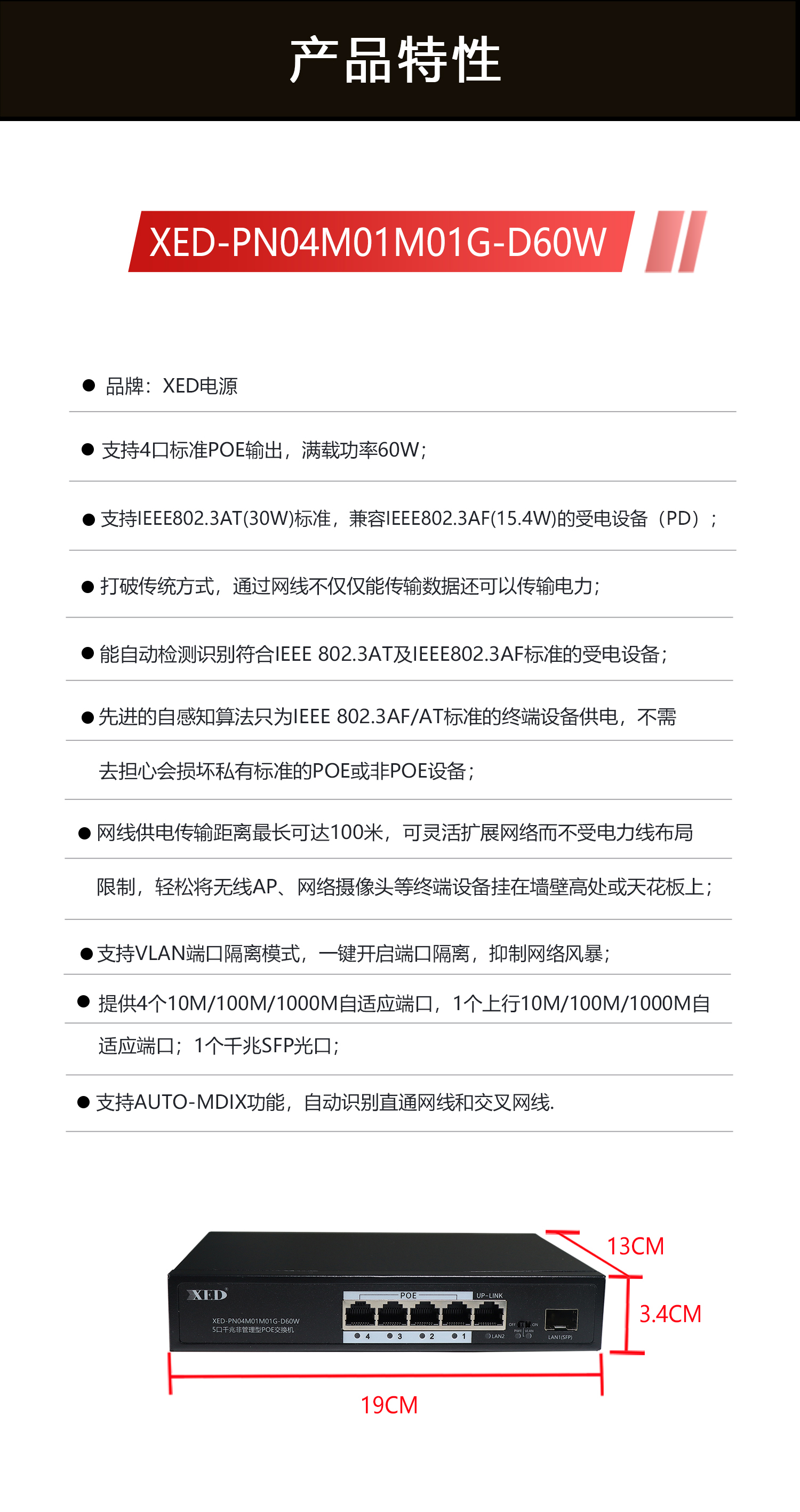 支持4口標(biāo)準(zhǔn)POE輸出,滿載功率60W;