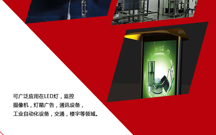 可廣泛應用于LED燈、監(jiān)控攝像機、燈箱廣告、通訊設備、工業(yè)自動化設備,交通,樓宇等領(lǐng)域。