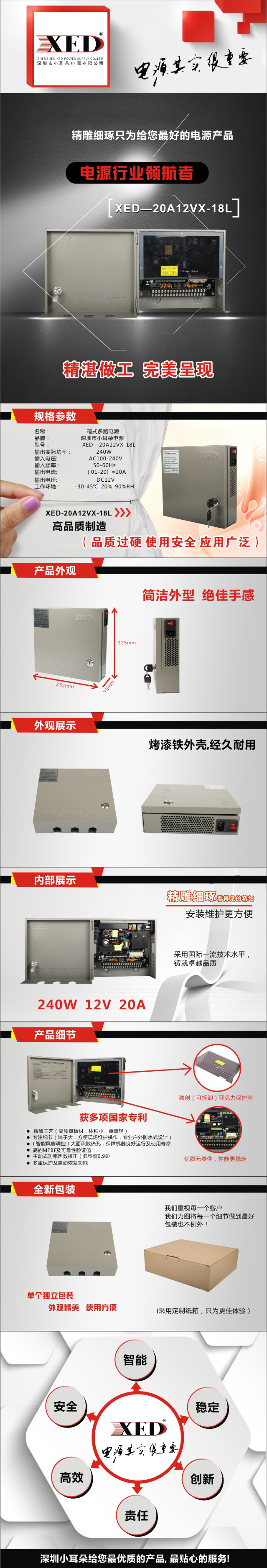 XED-20A12VX-18L箱式多路開(kāi)關(guān)電源,18路240W開(kāi)關(guān)電源,每一路標(biāo)準(zhǔn)足安12V20A,寬電壓AC100-240V輸入,適用室內(nèi)外多路接線使用。