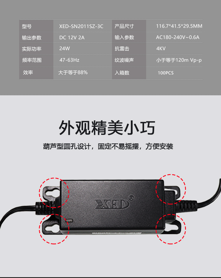 XED-SN2011SZ-3C室內(nèi)桌面式電源適配器,全新升級(jí)版12v2a,24w電源。電壓AC180-240V輸入,適用國內(nèi)范圍電壓。