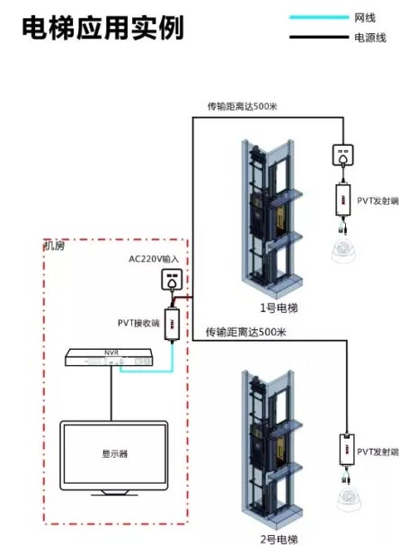 電梯內(nèi)安裝監(jiān)控攝像機,因其環(huán)境比較特殊,電梯要不停的上下運動,所以電梯網(wǎng)絡(luò)攝像機的布線傳輸有一定的特殊要求。傳統(tǒng)方式常用的主要有專用網(wǎng)線傳輸、無線網(wǎng)橋傳輸、電力貓傳輸方三種方式。這里只介紹一種類似于電力貓的傳輸方式——PVT視頻傳輸發(fā)射器、接收器。